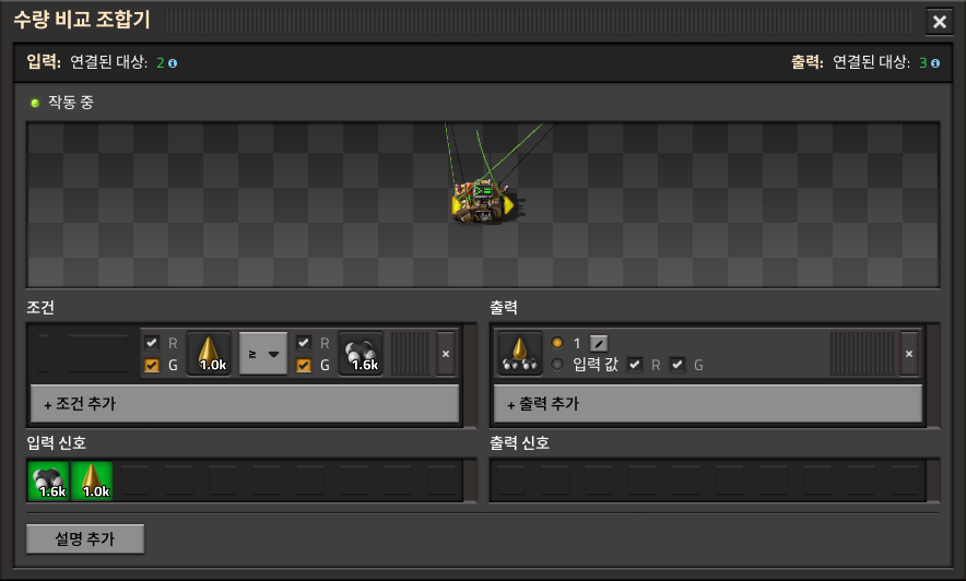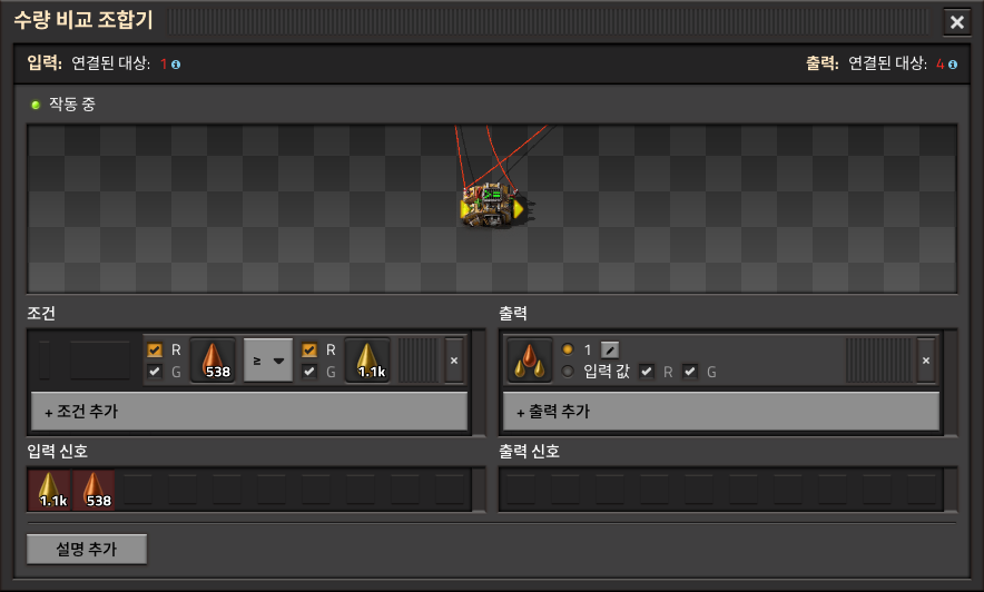 즉 아까 수량 비교 조합기에 지정한 신호를 여기도 동일하게 적용할 경우 해당 신호를 받을 때만 가동하도록 만들 수 있습니다.